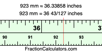 One millimeter is equal to 5/127 inches, and 923 as a fraction is 923/1. Therefore, to get the fractional answer to 923 mm in inches, we multiply 923/1 by 5/127 and simplify if necessary.
