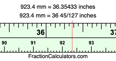 One millimeter is equal to 5/127 inches, and 923.4 as a fraction is 4617/5. Therefore, to get the fractional answer to 923.4 mm in inches, we multiply 4617/5 by 5/127 and simplify if necessary.