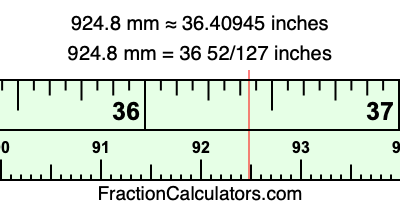 One millimeter is equal to 5/127 inches, and 924.8 as a fraction is 4624/5. Therefore, to get the fractional answer to 924.8 mm in inches, we multiply 4624/5 by 5/127 and simplify if necessary.