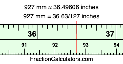 One millimeter is equal to 5/127 inches, and 927 as a fraction is 927/1. Therefore, to get the fractional answer to 927 mm in inches, we multiply 927/1 by 5/127 and simplify if necessary.