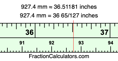 One millimeter is equal to 5/127 inches, and 927.4 as a fraction is 4637/5. Therefore, to get the fractional answer to 927.4 mm in inches, we multiply 4637/5 by 5/127 and simplify if necessary.