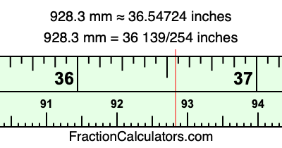 One millimeter is equal to 5/127 inches, and 928.3 as a fraction is 9283/10. Therefore, to get the fractional answer to 928.3 mm in inches, we multiply 9283/10 by 5/127 and simplify if necessary.