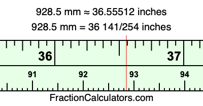 One millimeter is equal to 5/127 inches, and 928.5 as a fraction is 1857/2. Therefore, to get the fractional answer to 928.5 mm in inches, we multiply 1857/2 by 5/127 and simplify if necessary.