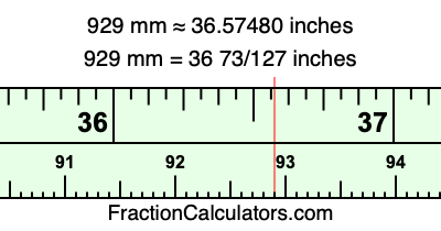 One millimeter is equal to 5/127 inches, and 929 as a fraction is 929/1. Therefore, to get the fractional answer to 929 mm in inches, we multiply 929/1 by 5/127 and simplify if necessary.