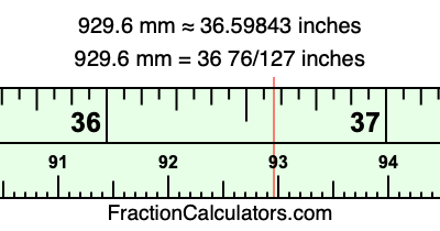 One millimeter is equal to 5/127 inches, and 929.6 as a fraction is 4648/5. Therefore, to get the fractional answer to 929.6 mm in inches, we multiply 4648/5 by 5/127 and simplify if necessary.