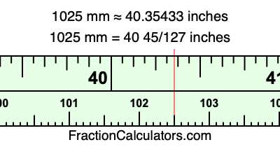 One millimeter is equal to 5/127 inches, and 1025 as a fraction is 1025/1. Therefore, to get the fractional answer to 1025 mm in inches, we multiply 1025/1 by 5/127 and simplify if necessary.