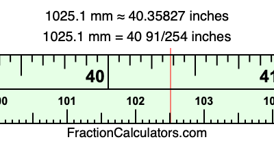 Here is how to convert 1025.1 mm to inches. We will give you the fractional answer, the decimal answer, and illustrate the answer on our tape measure.
