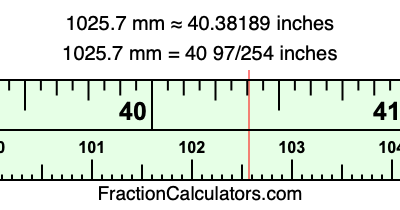 Here is how to convert 1025.7 mm to inches. We will give you the fractional answer, the decimal answer, and illustrate the answer on our tape measure.