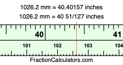 One millimeter is equal to 5/127 inches, and 1026.2 as a fraction is 5131/5. Therefore, to get the fractional answer to 1026.2 mm in inches, we multiply 5131/5 by 5/127 and simplify if necessary.