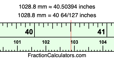 One millimeter is equal to 5/127 inches, and 1028.8 as a fraction is 5144/5. Therefore, to get the fractional answer to 1028.8 mm in inches, we multiply 5144/5 by 5/127 and simplify if necessary.