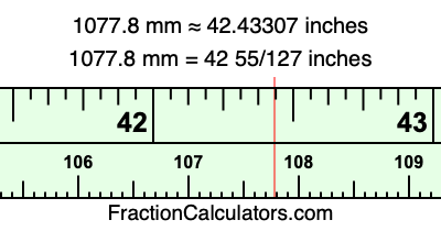 One millimeter is equal to 5/127 inches, and 1077.8 as a fraction is 5389/5. Therefore, to get the fractional answer to 1077.8 mm in inches, we multiply 5389/5 by 5/127 and simplify if necessary.