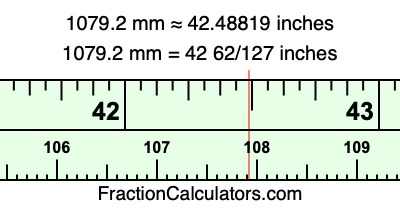 One millimeter is equal to 5/127 inches, and 1079.2 as a fraction is 5396/5. Therefore, to get the fractional answer to 1079.2 mm in inches, we multiply 5396/5 by 5/127 and simplify if necessary.
