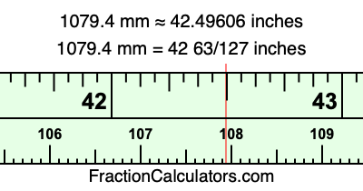 One millimeter is equal to 5/127 inches, and 1079.4 as a fraction is 5397/5. Therefore, to get the fractional answer to 1079.4 mm in inches, we multiply 5397/5 by 5/127 and simplify if necessary.