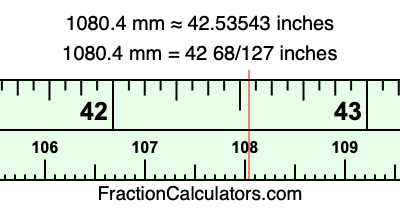 One millimeter is equal to 5/127 inches, and 1080.4 as a fraction is 5402/5. Therefore, to get the fractional answer to 1080.4 mm in inches, we multiply 5402/5 by 5/127 and simplify if necessary.