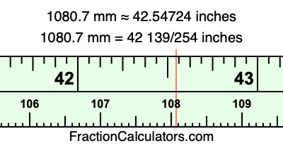 One millimeter is equal to 5/127 inches, and 1080.7 as a fraction is 10807/10. Therefore, to get the fractional answer to 1080.7 mm in inches, we multiply 10807/10 by 5/127 and simplify if necessary.
