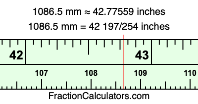 One millimeter is equal to 5/127 inches, and 1086.5 as a fraction is 2173/2. Therefore, to get the fractional answer to 1086.5 mm in inches, we multiply 2173/2 by 5/127 and simplify if necessary.