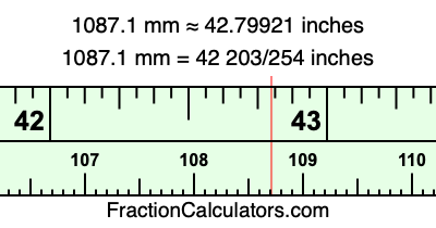 One millimeter is equal to 5/127 inches, and 1087.1 as a fraction is 10871/10. Therefore, to get the fractional answer to 1087.1 mm in inches, we multiply 10871/10 by 5/127 and simplify if necessary.