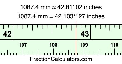 One millimeter is equal to 5/127 inches, and 1087.4 as a fraction is 5437/5. Therefore, to get the fractional answer to 1087.4 mm in inches, we multiply 5437/5 by 5/127 and simplify if necessary.