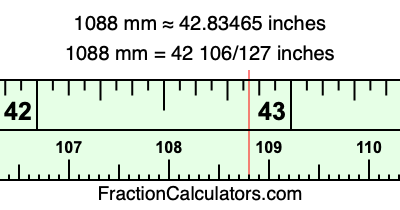 One millimeter is equal to 5/127 inches, and 1088 as a fraction is 1088/1. Therefore, to get the fractional answer to 1088 mm in inches, we multiply 1088/1 by 5/127 and simplify if necessary.