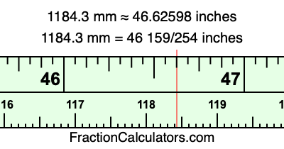 One millimeter is equal to 5/127 inches, and 1184.3 as a fraction is 11843/10. Therefore, to get the fractional answer to 1184.3 mm in inches, we multiply 11843/10 by 5/127 and simplify if necessary.