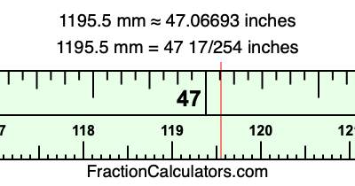 One millimeter is equal to 5/127 inches, and 1195.5 as a fraction is 2391/2. Therefore, to get the fractional answer to 1195.5 mm in inches, we multiply 2391/2 by 5/127 and simplify if necessary.
