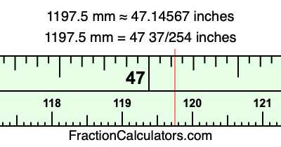One millimeter is equal to 5/127 inches, and 1197.5 as a fraction is 2395/2. Therefore, to get the fractional answer to 1197.5 mm in inches, we multiply 2395/2 by 5/127 and simplify if necessary.