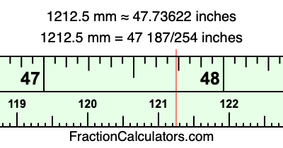 One millimeter is equal to 5/127 inches, and 1212.5 as a fraction is 2425/2. Therefore, to get the fractional answer to 1212.5 mm in inches, we multiply 2425/2 by 5/127 and simplify if necessary.