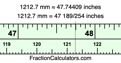 One millimeter is equal to 5/127 inches, and 1212.7 as a fraction is 12127/10. Therefore, to get the fractional answer to 1212.7 mm in inches, we multiply 12127/10 by 5/127 and simplify if necessary.