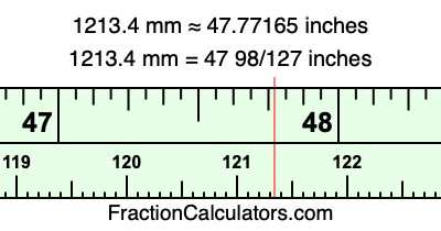 One millimeter is equal to 5/127 inches, and 1213.4 as a fraction is 6067/5. Therefore, to get the fractional answer to 1213.4 mm in inches, we multiply 6067/5 by 5/127 and simplify if necessary.