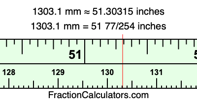 One millimeter is equal to 5/127 inches, and 1303.1 as a fraction is 13031/10. Therefore, to get the fractional answer to 1303.1 mm in inches, we multiply 13031/10 by 5/127 and simplify if necessary.
