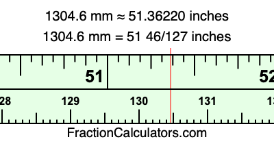 One millimeter is equal to 5/127 inches, and 1304.6 as a fraction is 6523/5. Therefore, to get the fractional answer to 1304.6 mm in inches, we multiply 6523/5 by 5/127 and simplify if necessary.
