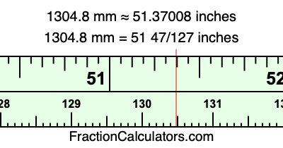 One millimeter is equal to 5/127 inches, and 1304.8 as a fraction is 6524/5. Therefore, to get the fractional answer to 1304.8 mm in inches, we multiply 6524/5 by 5/127 and simplify if necessary.