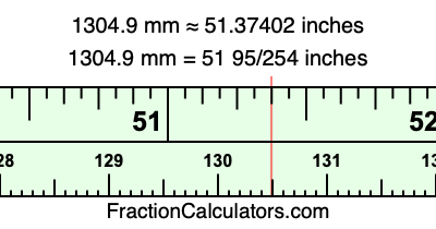 One millimeter is equal to 5/127 inches, and 1304.9 as a fraction is 13049/10. Therefore, to get the fractional answer to 1304.9 mm in inches, we multiply 13049/10 by 5/127 and simplify if necessary.