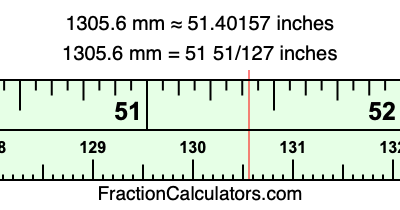 One millimeter is equal to 5/127 inches, and 1305.6 as a fraction is 6528/5. Therefore, to get the fractional answer to 1305.6 mm in inches, we multiply 6528/5 by 5/127 and simplify if necessary.