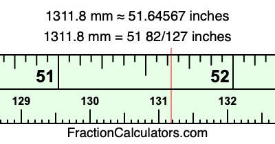 One millimeter is equal to 5/127 inches, and 1311.8 as a fraction is 6559/5. Therefore, to get the fractional answer to 1311.8 mm in inches, we multiply 6559/5 by 5/127 and simplify if necessary.