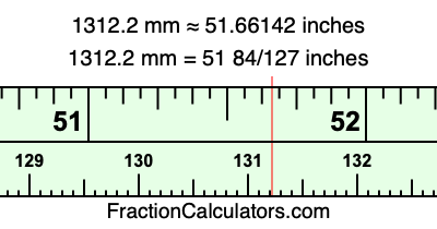 One millimeter is equal to 5/127 inches, and 1312.2 as a fraction is 6561/5. Therefore, to get the fractional answer to 1312.2 mm in inches, we multiply 6561/5 by 5/127 and simplify if necessary.