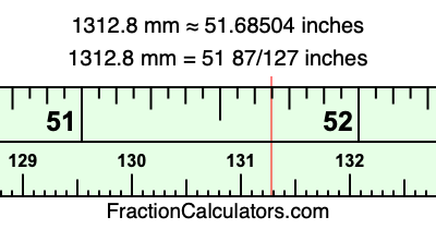 Here is how to convert 1312.8 mm to inches. We will give you the fractional answer, the decimal answer, and illustrate the answer on our tape measure.