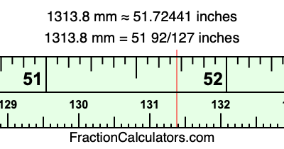 One millimeter is equal to 5/127 inches, and 1313.8 as a fraction is 6569/5. Therefore, to get the fractional answer to 1313.8 mm in inches, we multiply 6569/5 by 5/127 and simplify if necessary.