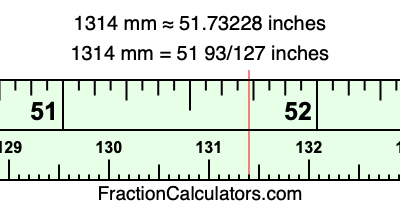One millimeter is equal to 5/127 inches, and 1314 as a fraction is 1314/1. Therefore, to get the fractional answer to 1314 mm in inches, we multiply 1314/1 by 5/127 and simplify if necessary.