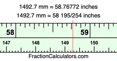 One millimeter is equal to 5/127 inches, and 1492.7 as a fraction is 14927/10. Therefore, to get the fractional answer to 1492.7 mm in inches, we multiply 14927/10 by 5/127 and simplify if necessary.
