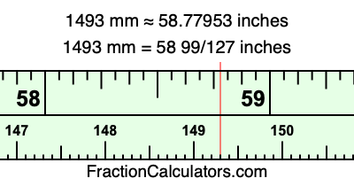 One millimeter is equal to 5/127 inches, and 1493 as a fraction is 1493/1. Therefore, to get the fractional answer to 1493 mm in inches, we multiply 1493/1 by 5/127 and simplify if necessary.