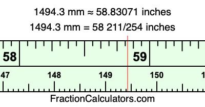 One millimeter is equal to 5/127 inches, and 1494.3 as a fraction is 14943/10. Therefore, to get the fractional answer to 1494.3 mm in inches, we multiply 14943/10 by 5/127 and simplify if necessary.