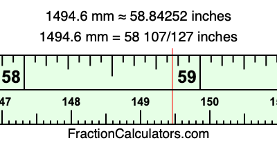 One millimeter is equal to 5/127 inches, and 1494.6 as a fraction is 7473/5. Therefore, to get the fractional answer to 1494.6 mm in inches, we multiply 7473/5 by 5/127 and simplify if necessary.