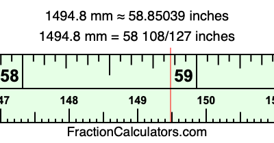 One millimeter is equal to 5/127 inches, and 1494.8 as a fraction is 7474/5. Therefore, to get the fractional answer to 1494.8 mm in inches, we multiply 7474/5 by 5/127 and simplify if necessary.