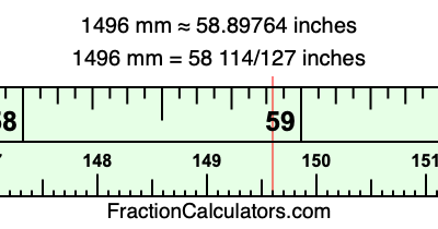One millimeter is equal to 5/127 inches, and 1496 as a fraction is 1496/1. Therefore, to get the fractional answer to 1496 mm in inches, we multiply 1496/1 by 5/127 and simplify if necessary.