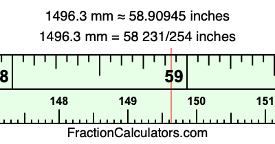 One millimeter is equal to 5/127 inches, and 1496.3 as a fraction is 14963/10. Therefore, to get the fractional answer to 1496.3 mm in inches, we multiply 14963/10 by 5/127 and simplify if necessary.