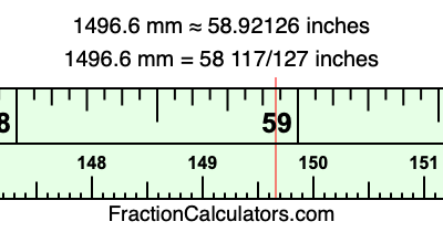 One millimeter is equal to 5/127 inches, and 1496.6 as a fraction is 7483/5. Therefore, to get the fractional answer to 1496.6 mm in inches, we multiply 7483/5 by 5/127 and simplify if necessary.