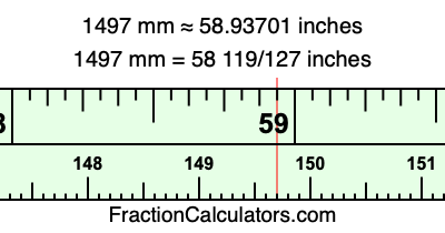 One millimeter is equal to 5/127 inches, and 1497 as a fraction is 1497/1. Therefore, to get the fractional answer to 1497 mm in inches, we multiply 1497/1 by 5/127 and simplify if necessary.