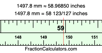 Here is how to convert 1497.8 mm to inches. We will give you the fractional answer, the decimal answer, and illustrate the answer on our tape measure.