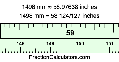 One millimeter is equal to 5/127 inches, and 1498 as a fraction is 1498/1. Therefore, to get the fractional answer to 1498 mm in inches, we multiply 1498/1 by 5/127 and simplify if necessary.
